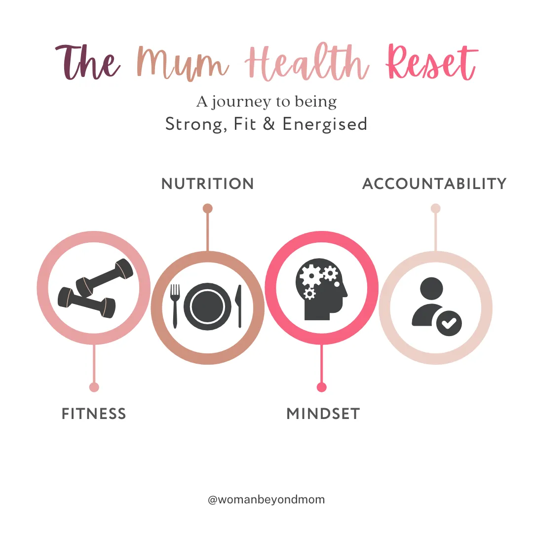 The Mums' Health Reset looks at health from a global perspective including Nutrition, Fitness, Mindset (some of your actual thoughts need to change to make this long term) and most importantly Accountability.